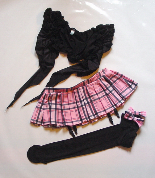 Kurzer Faltenmini mit Strumpfhaltern, 3tlg. Oberteil zum binden, Rock, Strümpfe, die Strümpfe sind jeweils neu. Größe S/M